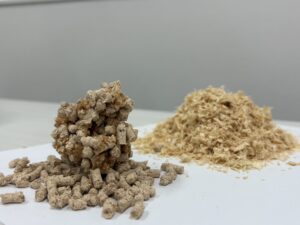 渡邉副社長:はい、一番わかりやすい取り組みで申し上げますと、もともと産業廃棄物として処理されていたものを原料として、再び製品としてよみがえらせるというアップサイクルの仕組みを導入しております。具体的には猫砂の生産において,おからやヒノキといった副産物を利用しています。これらは通常であれば産業廃棄物として廃棄されてしまうものなのですが、それを資源として活用することで,新たな製品に生まれ変わらせています。特にヒノキについては,「富士ヒノキ」というブランドに認定された良質な木材の加工時に発生するおが粉を使用しており、地域資源の有効活用にもつながっています。つまり、捨てられるはずだったものを利用し、猫砂として世の中に送り出しているのです。