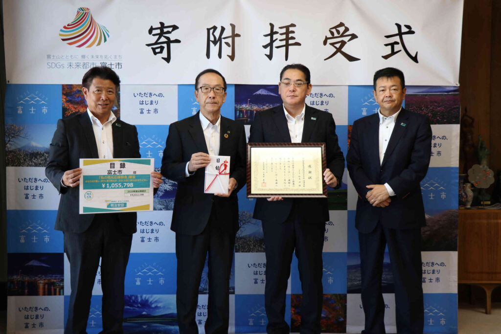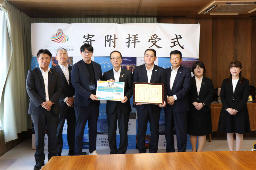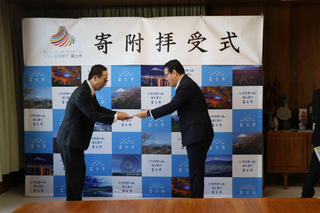 令和7年10月17日(金)10時30分より、SDGsプロジェクト「耕作放棄茶園をなくせ!「地域課題×環境経営」で問題解決に挑む」を応援するため、企業からの寄附金を富士市が受領する式典が催されました。