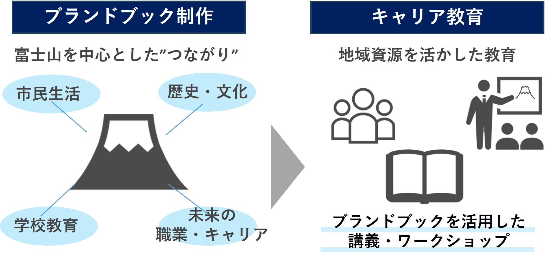 本事業では、富士山の恩恵や歴史に触れながら地域の良さや市内産業の役割・魅力も併せて紹介する「富士山のおかげブランドブック」を制作し、小学校中学年から高学年までを主な対象としたキャリア教育を実践する。富士市の象徴である富士山への感謝を通じて、子どもたちに郷土愛を醸成することで、地元での就業意識を高め、地域社会の持続的発展に寄与することを目的としている。